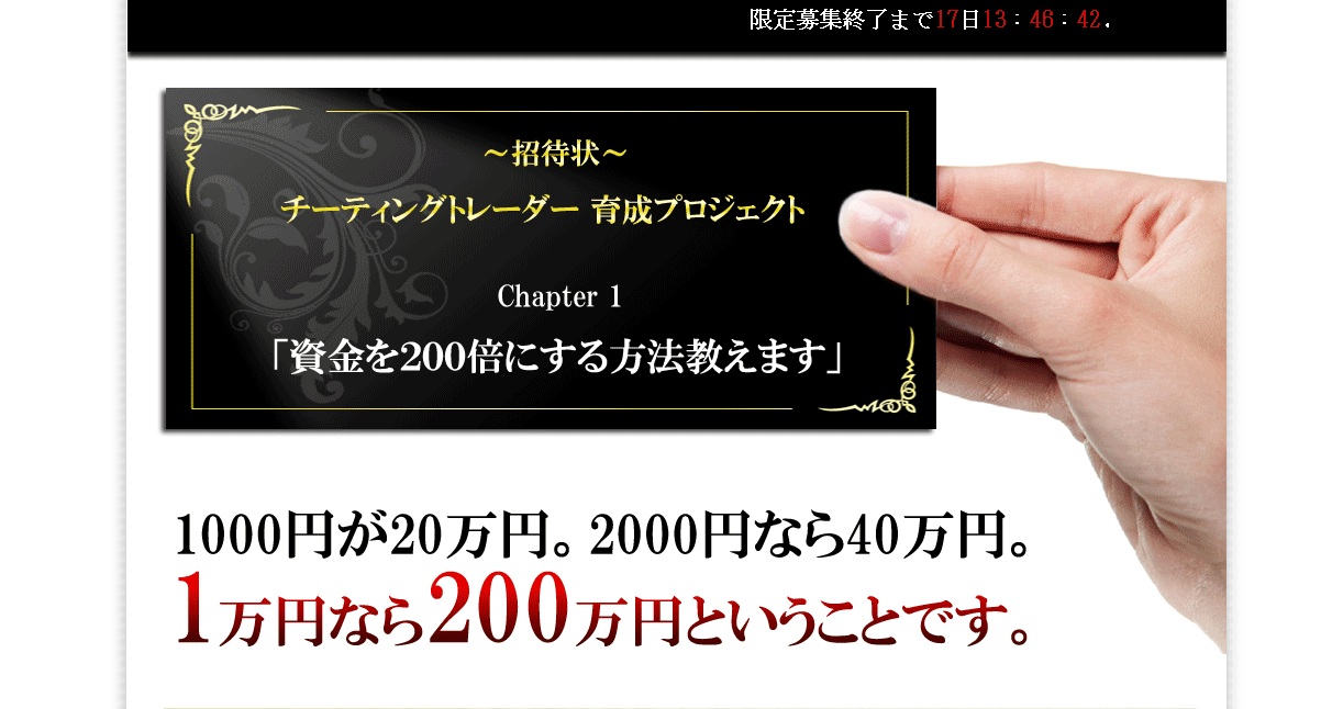 『チーティングトレーダー育成プロジェクトChapter1』こちらでチーティングトレーダー育成プロジェクトChapter1をお申込みの方に、ビックなおまけ特典をプレゼントします。