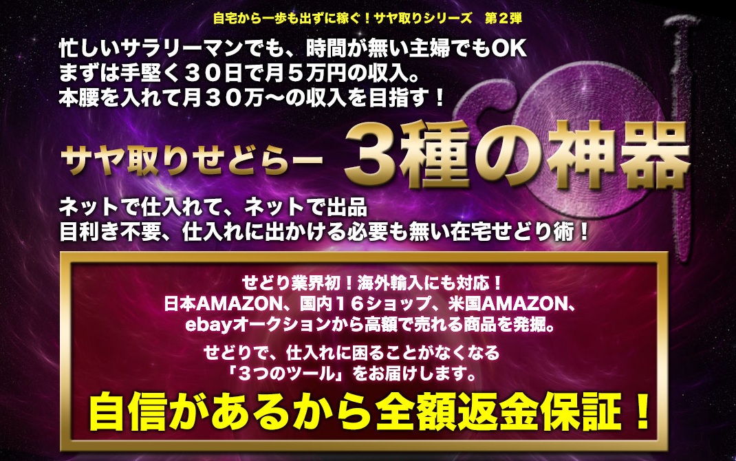 『電脳せどりツール「サヤ取りせどらー3種の神器」プロ版』こちらで電脳せどりツール「サヤ取りせどらー3種の神器」プロ版をお申込みの方に、ビックなおまけ特典をプレゼントします。