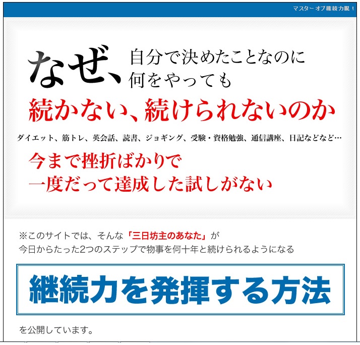 ですので、もし少しでもあなたが「続けられない」という悩みを抱えているのなら、この「眠っている継続力をフルに発揮できるようになるマニュアル」の内容を知ってください。