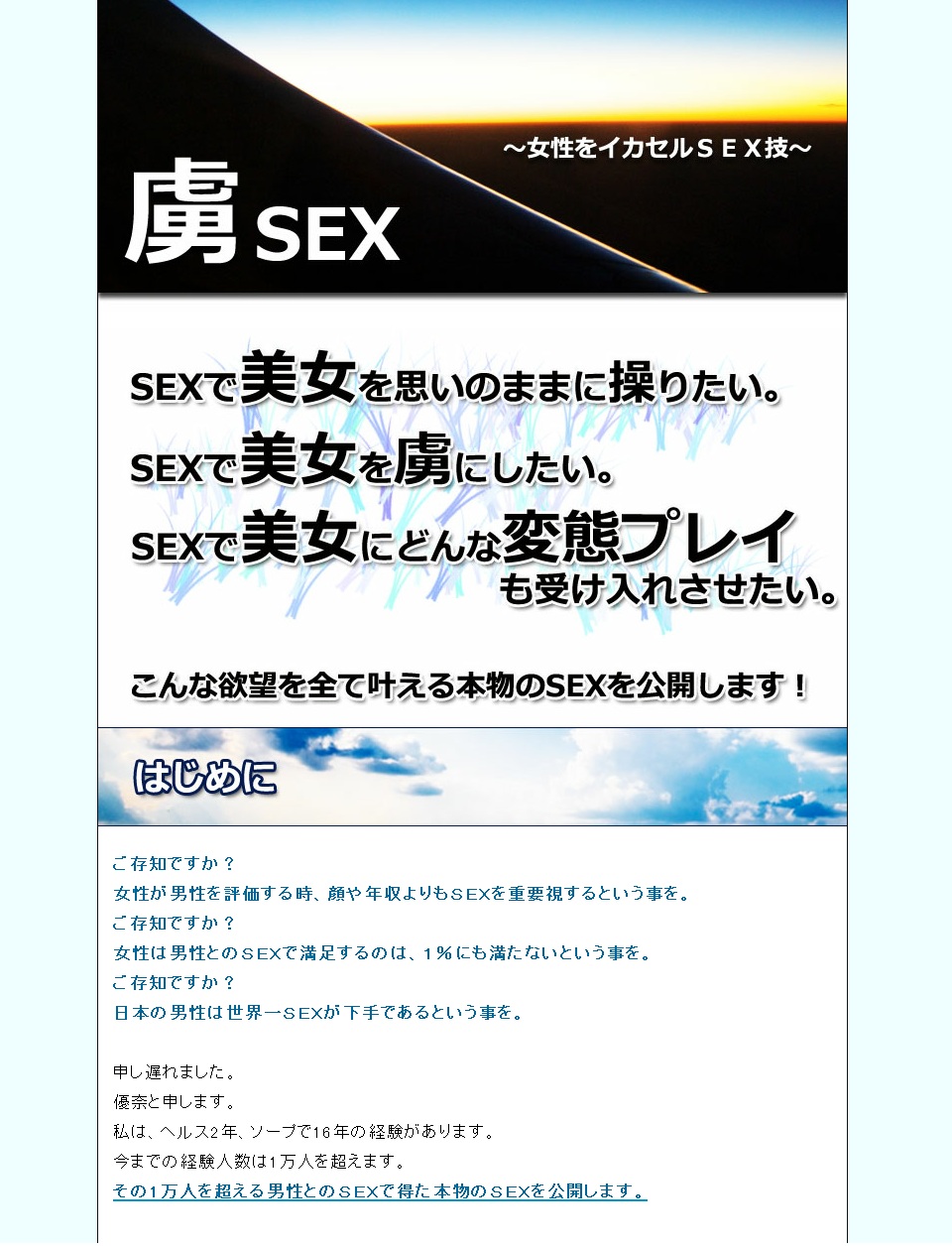 虜SEX~女を強制SEX中毒化~365日返金保証!3万人の男性とSEXを経験した風俗嬢が本物のSEXテクニック大公開!マ○コもアナルも貴方の虜にするSEXマニュアル